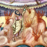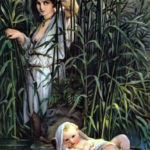 Kunti is scandalized that anyone should find out she is an unwed mother, so, in a precursor of the Moses story, she puts baby Karna in a basket and floats him on the Ashwanadi River. He is found by a charioteer and enjoys a happy childhood. As he grows into manhood, he becomes fascinated with the art of war and masters ordinary weapons and the martial arts quickly, but he yearns to learn to wield the divine weapons. The teacher Dronacharya refuses to teach him, as he is only the son of a charioteer, so Karna disguises himself as a Brahmin to sign up with Dronacharya’s own guru, Parashurama. Karna learns everything Parashurama knows and becomes his equal in skill before the guru discovers he’s been tricked.