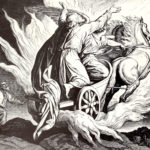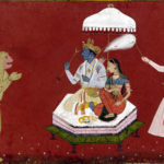 The maiden Kunti renders excellent care to a wise old sage, who rewards her with a mantra through which she can have a child with any god she chooses. Although still unmarried, she uses the mantra to compel the sun god Surya to appear, and he arrives carrying her new son. The baby is radiant and powerful like his father, and is wearing armor and divine earrings called Kundala.